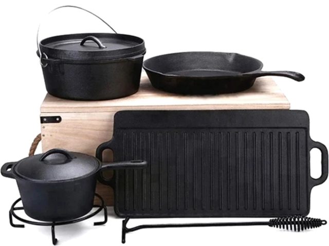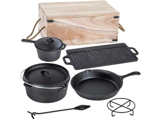 Set de gătit din fontă, 7 piese, ideal pentru prepararea mâncărurilor pe foc deschis, plite, cuptor sau jar. Rezistent și versatil, necesită ungere după curățare pentru protecție optimă. Include oală, tigaie, cratiță, plită grătar, cârlig, suport și cutie din lemn.